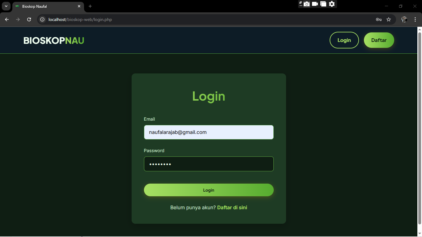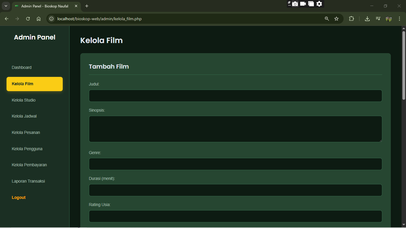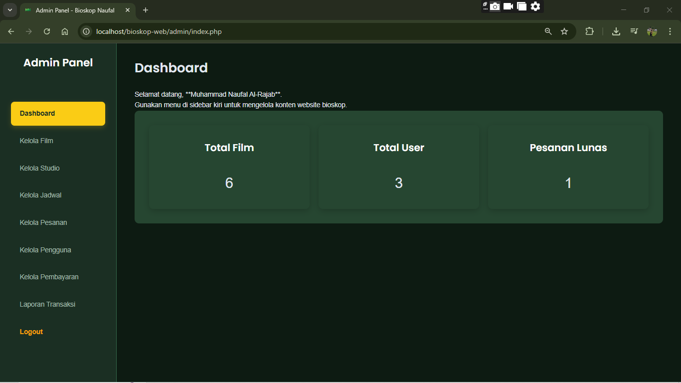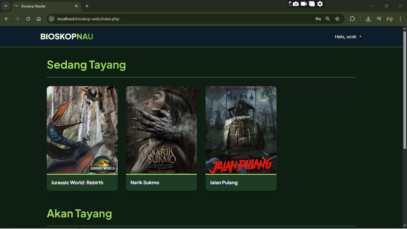 Bioskop Naufal, atau dikenal sebagai Bioskop Nau, adalah platform pemesanan dan informasi film modern yang menghadirkan pengalaman menonton layaknya bioskop nyata dalam tampilan digital yang elegan. Website ini dirancang dengan antarmuka hijau gradasi yang segar dan profesional, menampilkan jadwal tayang, daftar film terbaru, serta sistem pengelolaan admin yang rapi dan responsif. Dengan desain modern dan navigasi yang mudah, Bioskop Nau menjadi tempat ideal bagi pecinta film untuk menjelajahi berbagai tayangan menarik, sekaligus bagi pengelola untuk mengatur data film dan jadwal dengan efisien.