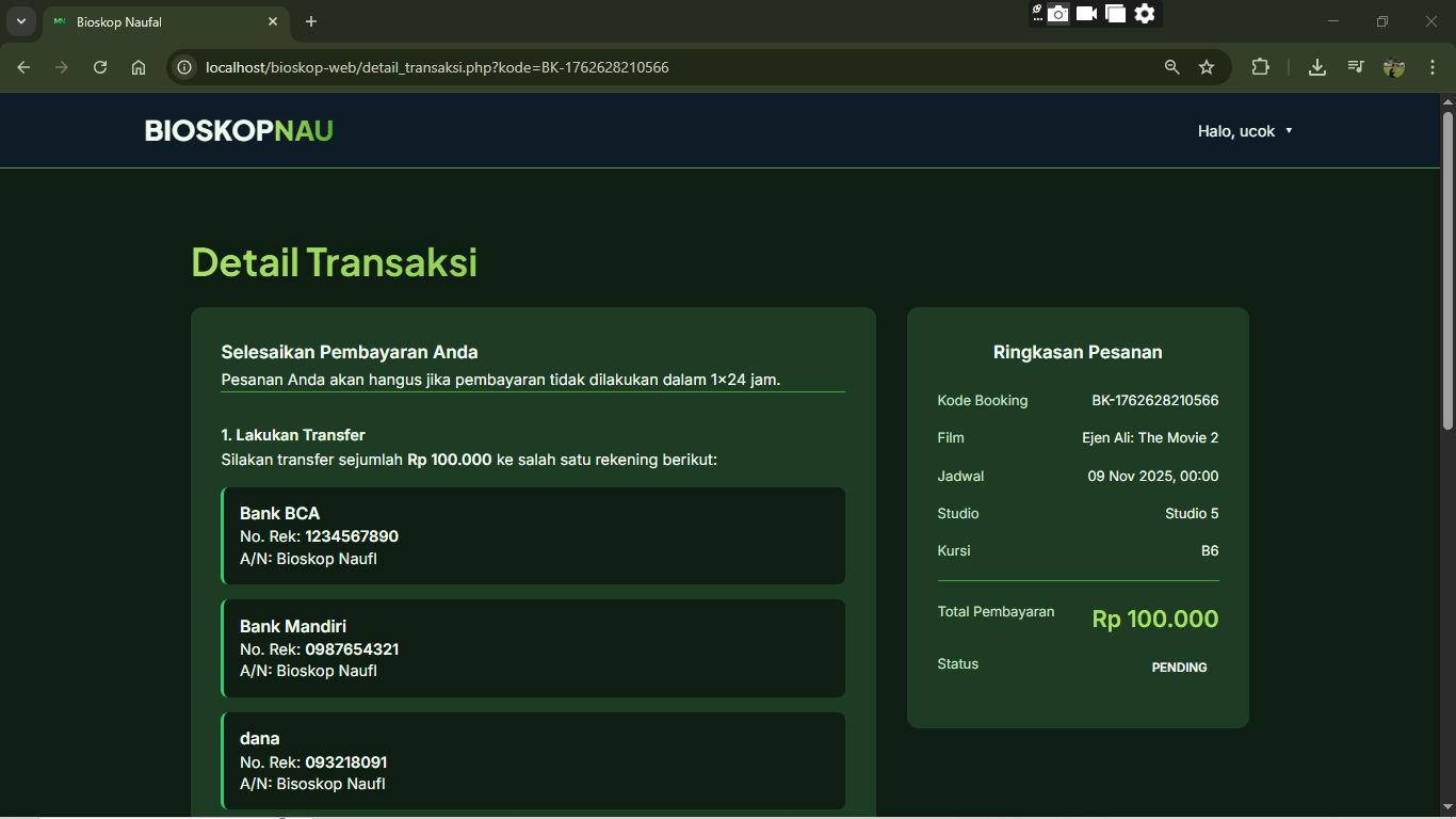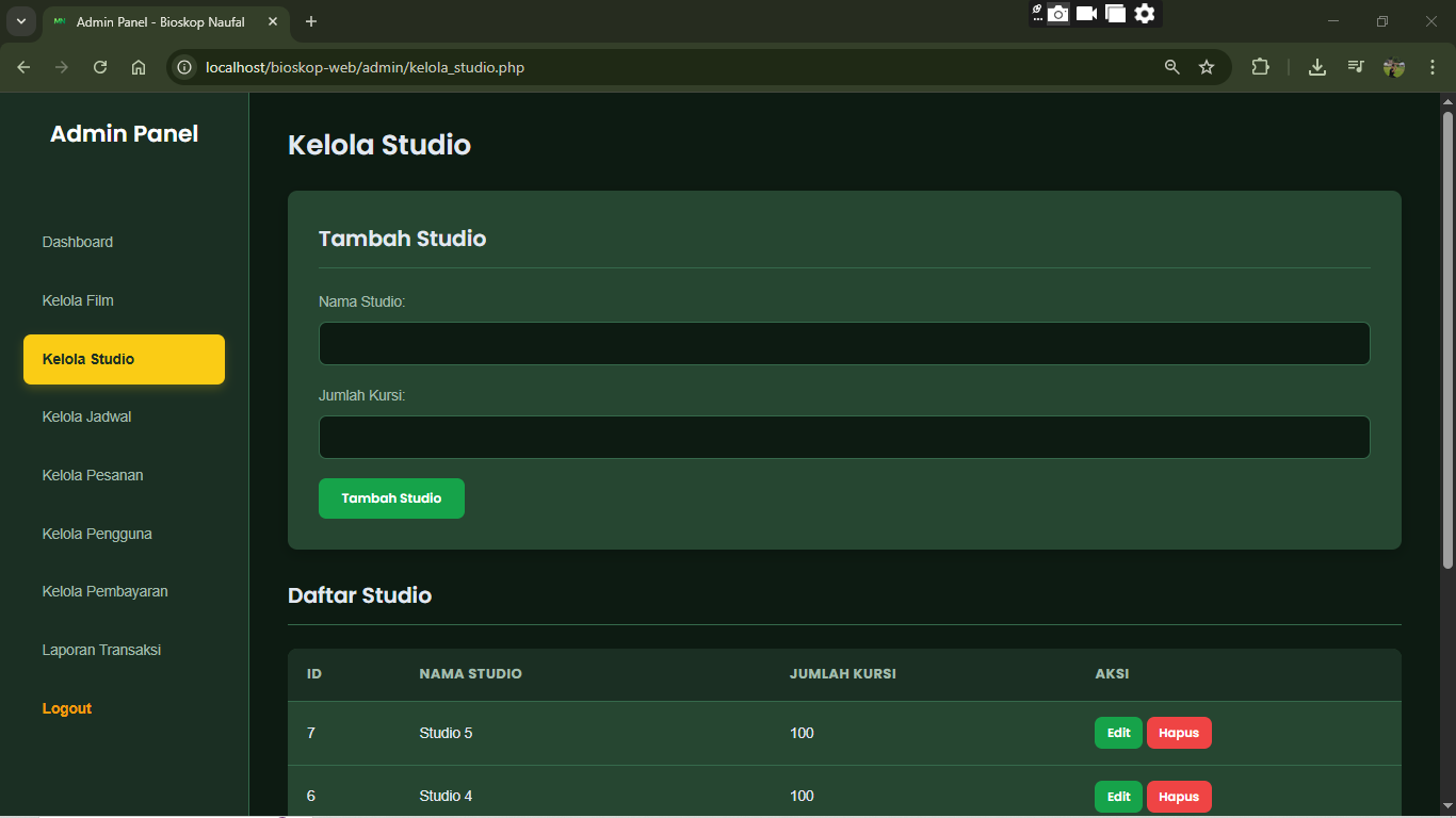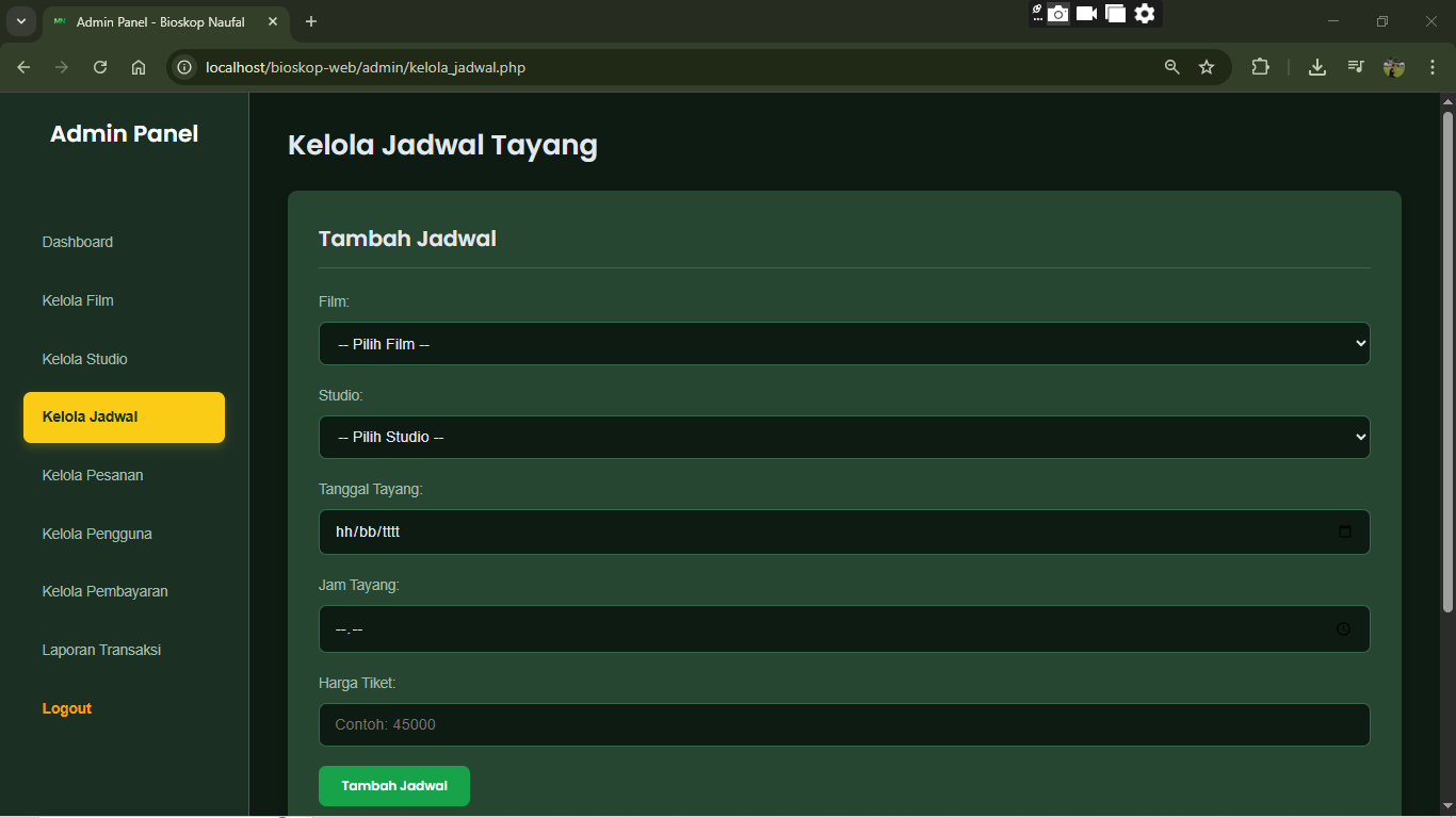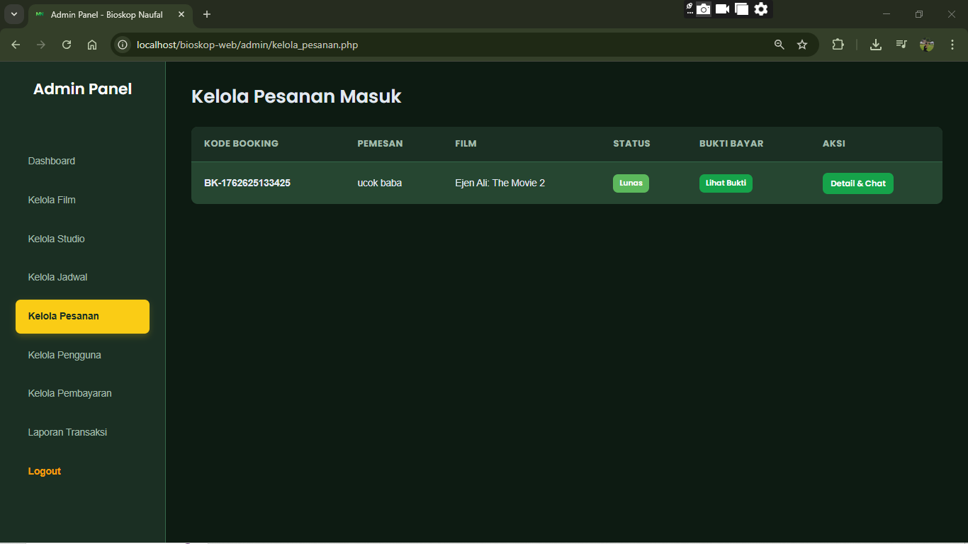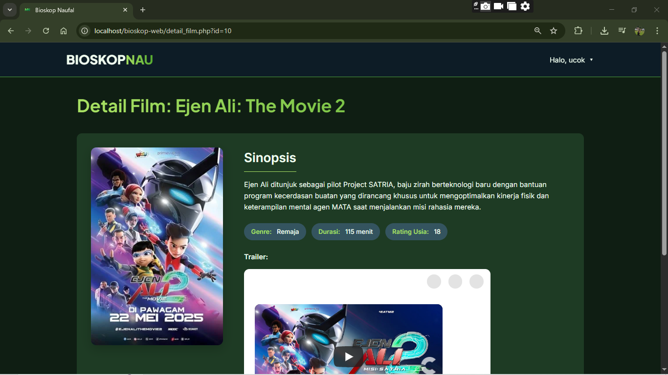 Bioskop Naufal, atau dikenal sebagai Bioskop Nau, adalah platform pemesanan dan informasi film modern yang menghadirkan pengalaman menonton layaknya bioskop nyata dalam tampilan digital yang elegan. Website ini dirancang dengan antarmuka hijau gradasi yang segar dan profesional, menampilkan jadwal tayang, daftar film terbaru, serta sistem pengelolaan admin yang rapi dan responsif. Dengan desain modern dan navigasi yang mudah, Bioskop Nau menjadi tempat ideal bagi pecinta film untuk menjelajahi berbagai tayangan menarik, sekaligus bagi pengelola untuk mengatur data film dan jadwal dengan efisien.
