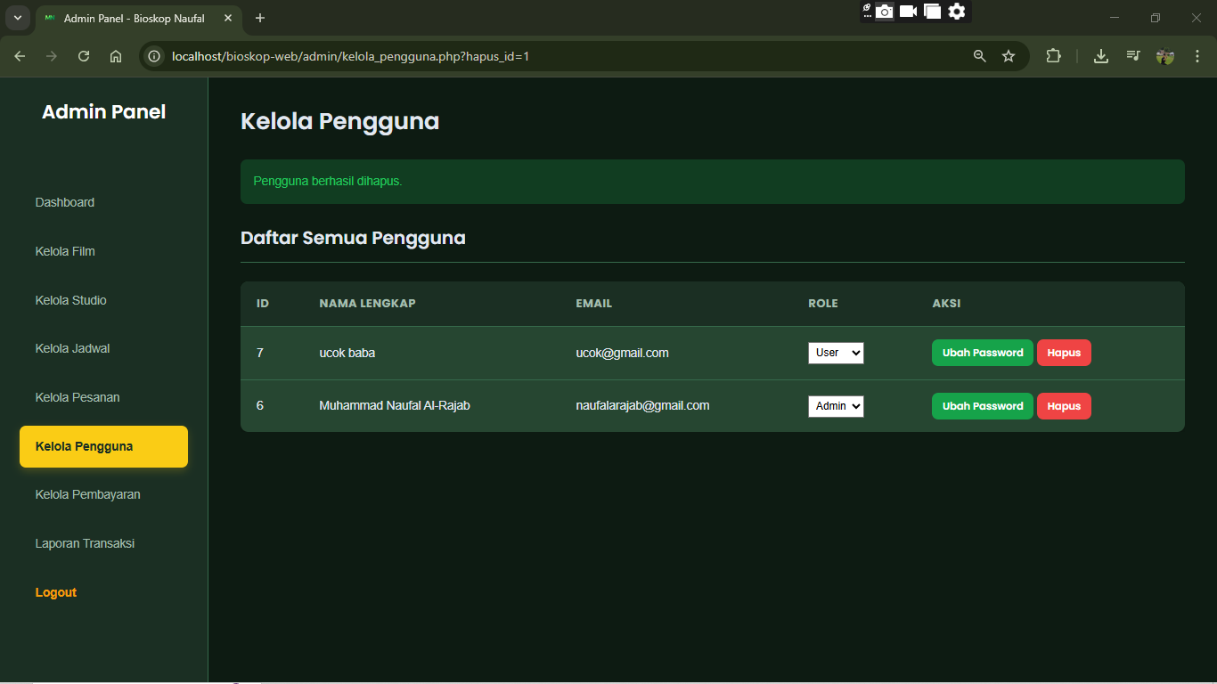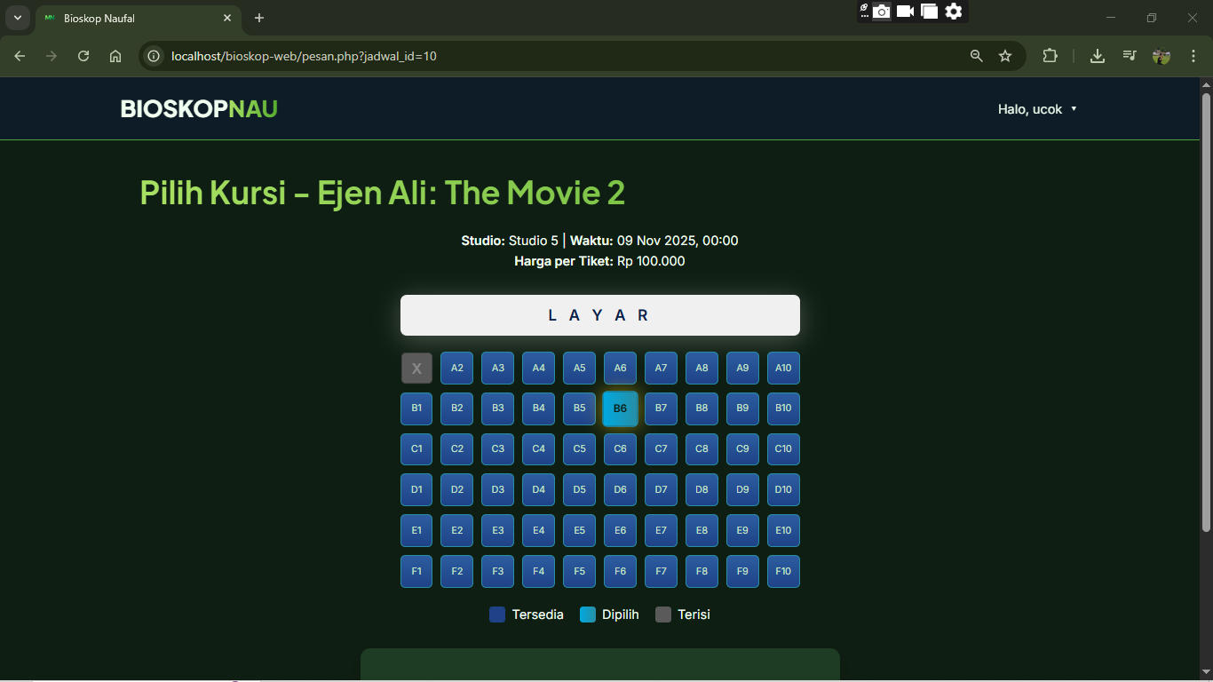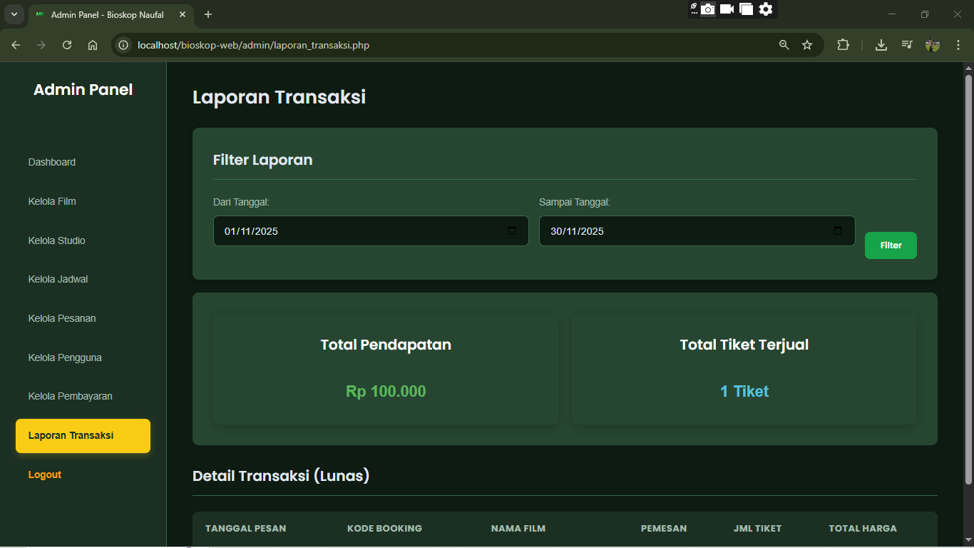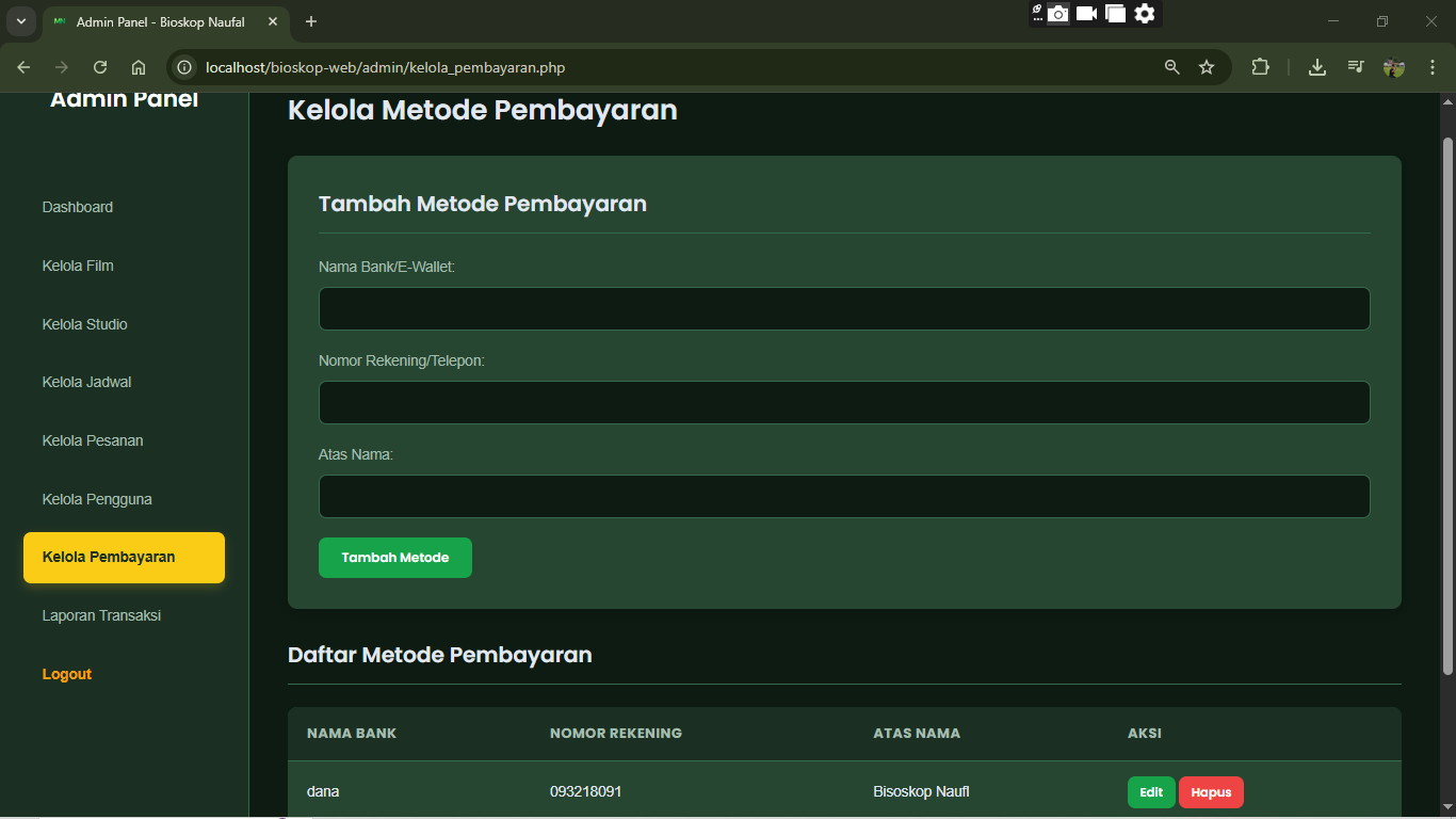 Bioskop Naufal, atau dikenal sebagai Bioskop Nau, adalah platform pemesanan dan informasi film modern yang menghadirkan pengalaman menonton layaknya bioskop nyata dalam tampilan digital yang elegan. Website ini dirancang dengan antarmuka hijau gradasi yang segar dan profesional, menampilkan jadwal tayang, daftar film terbaru, serta sistem pengelolaan admin yang rapi dan responsif. Dengan desain modern dan navigasi yang mudah, Bioskop Nau menjadi tempat ideal bagi pecinta film untuk menjelajahi berbagai tayangan menarik, sekaligus bagi pengelola untuk mengatur data film dan jadwal dengan efisien.
